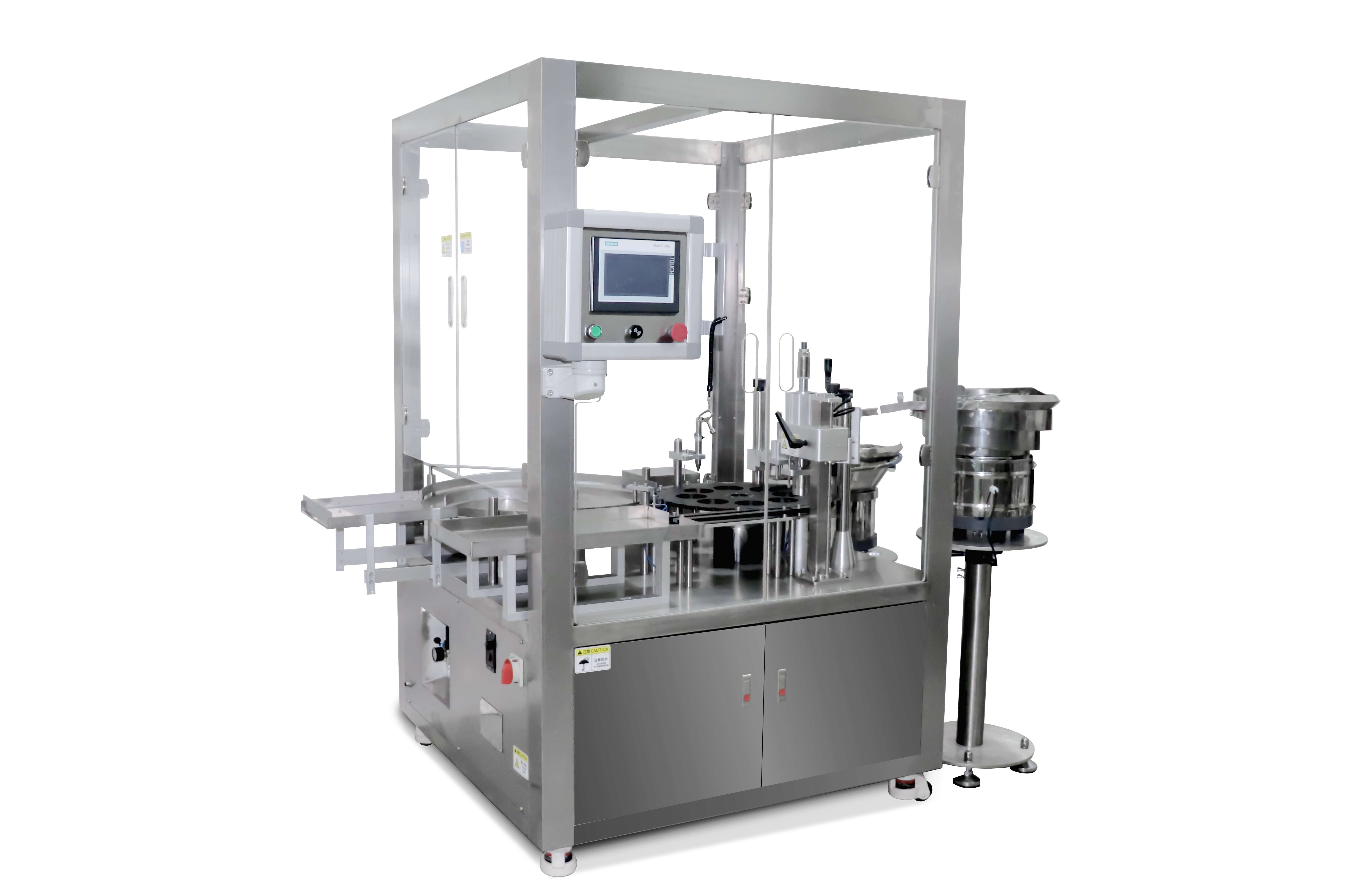 3、實(shí)現(xiàn)同款瓶直徑,封口高低可調(diào),無(wú)內(nèi)塞自動(dòng)報(bào)警。放瓶和出瓶為同一方向,方便于人員操作。